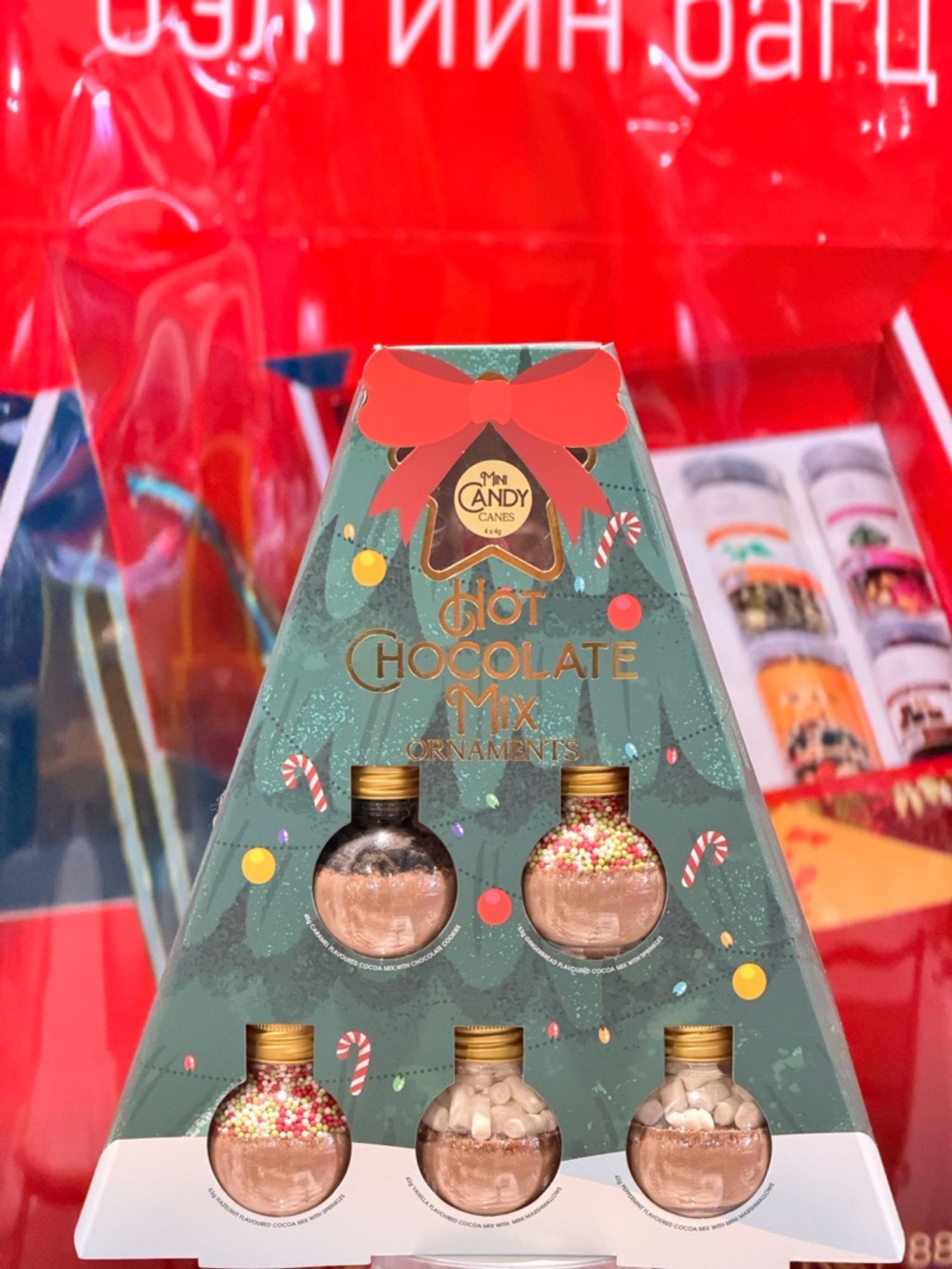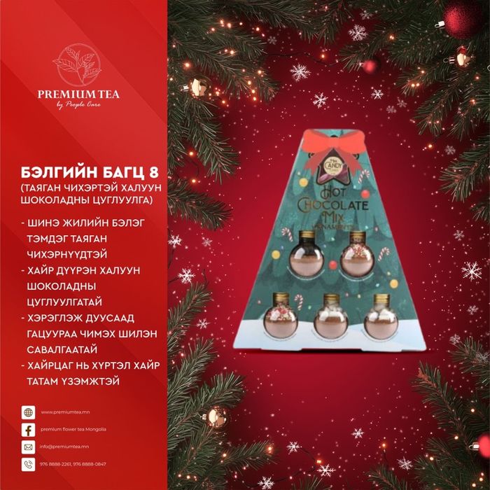 (Таяган чихэртэй халуун шоколадны цуглуулга) - шинэ жилийн бэлэг тэмдэг таяган чихэрнүүдтэй - Хайр дүүрэн халуун шоколадны цуглуулгатай - Хэрэглэж дуусаад гацуураа чимэх шилэн савалгаатай - Хайрцаг нь хүртэл хайр татам үзэмжтэй