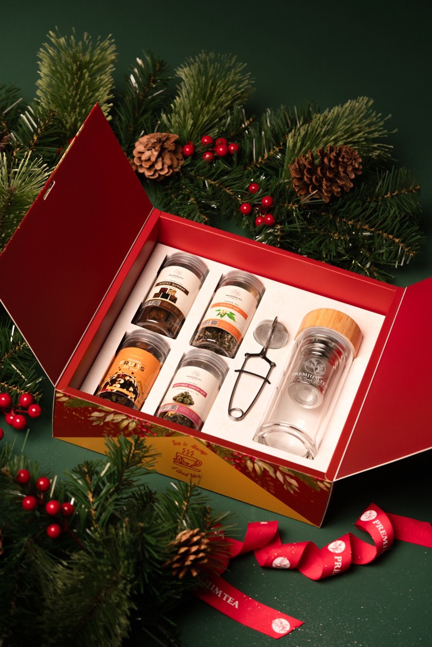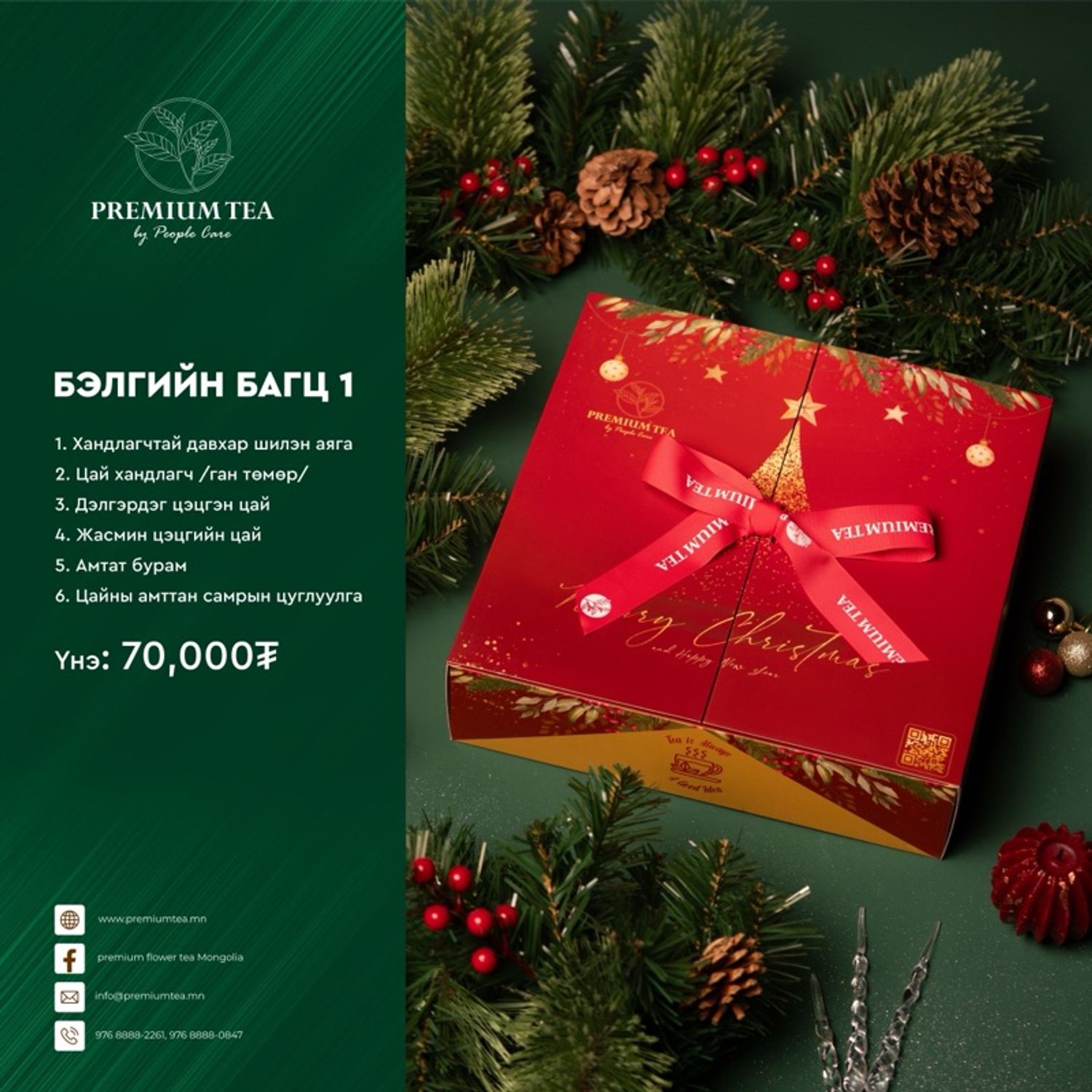 1. Хандлагчтай давхар шилэн аяга 2. Цай хандлагч /ган төмөр/ 3. Дэлгэрдэг цэцгэн цай 4. Жасмин цэцгийн цай 5. Амтат бурам 6. Цайны амттан самрын цуглуулга